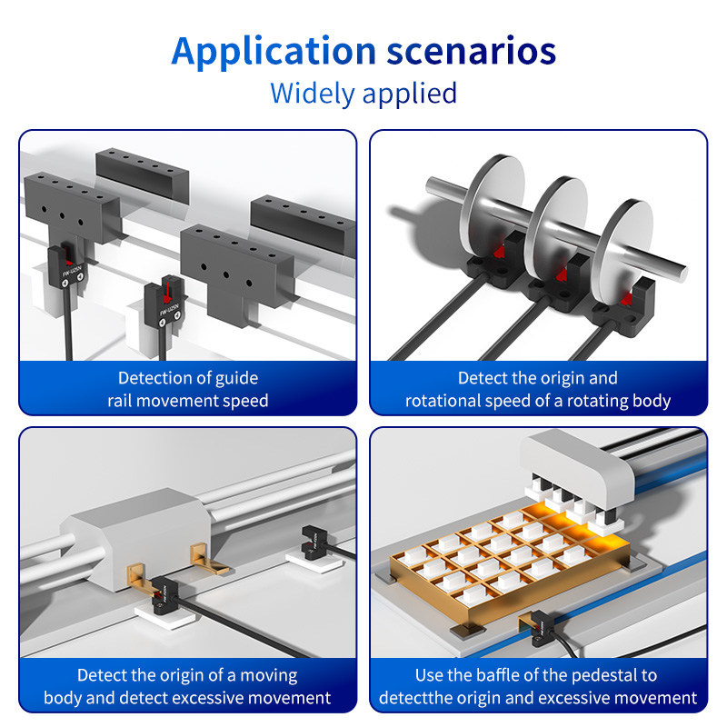 The versatility of the FW25 U-groove sensor makes it a go-to component across numerous industries, including packaging, material handling, CNC machining, and assembly automation.Detection of Guide Rail Movement Speed: In linear motion systems, a flag mounted on a moving carriage can pass through the U-groove. By counting the pulses over time, the FW25 can accurately calculate the linear speed of the guide rail, enabling speed monitoring and control.Detect the Origin and Over-travel of a Moving Body: The sensor is perfectly suited for homing sequences. A tab on a linear actuator or robot arm passes through the groove, providing a precise "home" or "origin" signal to the controller. Additionally, a second sensor can be placed at the end of the travel to detect over-travel, preventing mechanical damage and ensuring operational safety.Detect the Origin and Rotational Speed of a Rotating Body: Mount a single tab or a multi-toothed wheel on a rotating shaft. As each tab passes through the 5mm groove, the FW25 generates a pulse. A single pulse per revolution provides origin data, while multiple pulses allow for accurate rotational speed calculation (RPM), essential for motor control and process monitoring.Use with Mounting Bracket Baffles for Positioning: Many systems use simple, fixed baffles. The FW25 can be paired with its mounting bracket or custom fixtures to detect the presence or position of these baffles, creating a simple and cost-effective limit switching system.