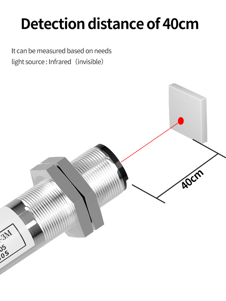 Adopting infrared invisible light source, it supports 0-40cm freely adjustable detection distance, and can accurately match the demand of working conditions through the knob. Whether it is 30cm distance for carton detection in logistics sorting or 15cm for parts positioning in machining, non-contact detection can be realized through the “visible scale + invisible infrared beam”, avoiding the impact of visible light interference on the human eye, and taking into account the flexibility and comfort.