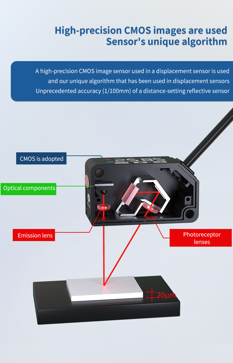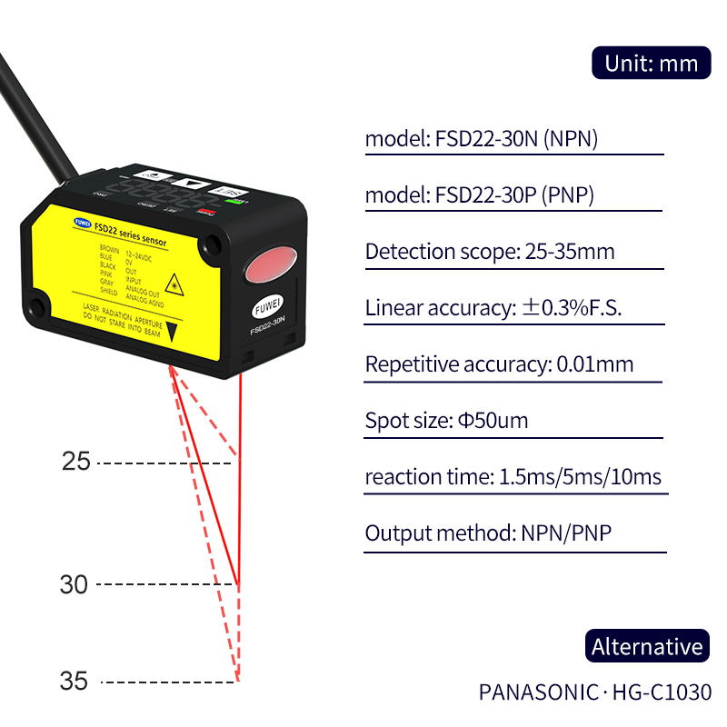 Core Technology Breakthrough: Precision Soars to New Heights The FSD22 series employs high-precision CMOS image sensors combined with Fuwei Electronics' proprietary core algorithms, achieving a technological breakthrough in distance-setting reflective sensors: precision reaches an astonishing 1/100mm, far surpassing traditional sensor performance. Unique algorithmic processing ensures stable, reliable measurement data under various conditions, maintaining exceptional detection stability even on reflective surfaces or complex backgrounds.