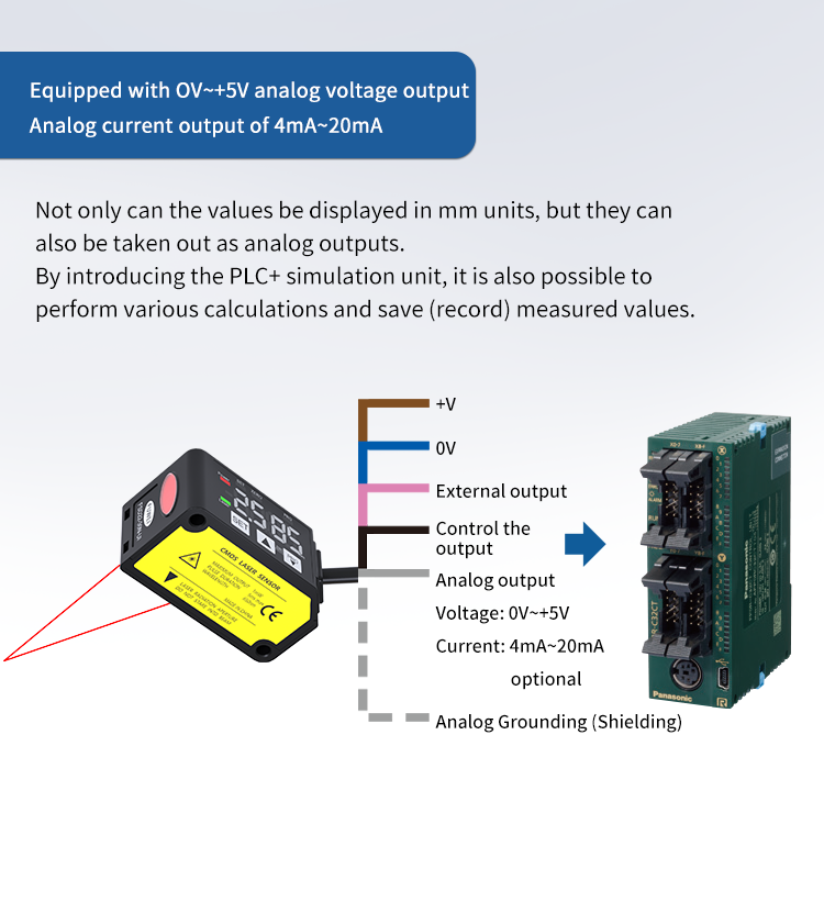 Flexible Output for Seamless Industrial Integration Beyond displaying measurements directly in millimeters, the FSD22 series provides analog outputs (0-5V/4-20mA) for direct integration with PLC+analog units, enabling: Real-time transmission and processing of measurement data Seamless integration with existing control systems Support for saving and recording measurement values Facilitating data analysis and process optimization This flexibility enables rapid deployment of the FSD22 series across diverse automated production lines, significantly enhancing the intelligence of detection processes.