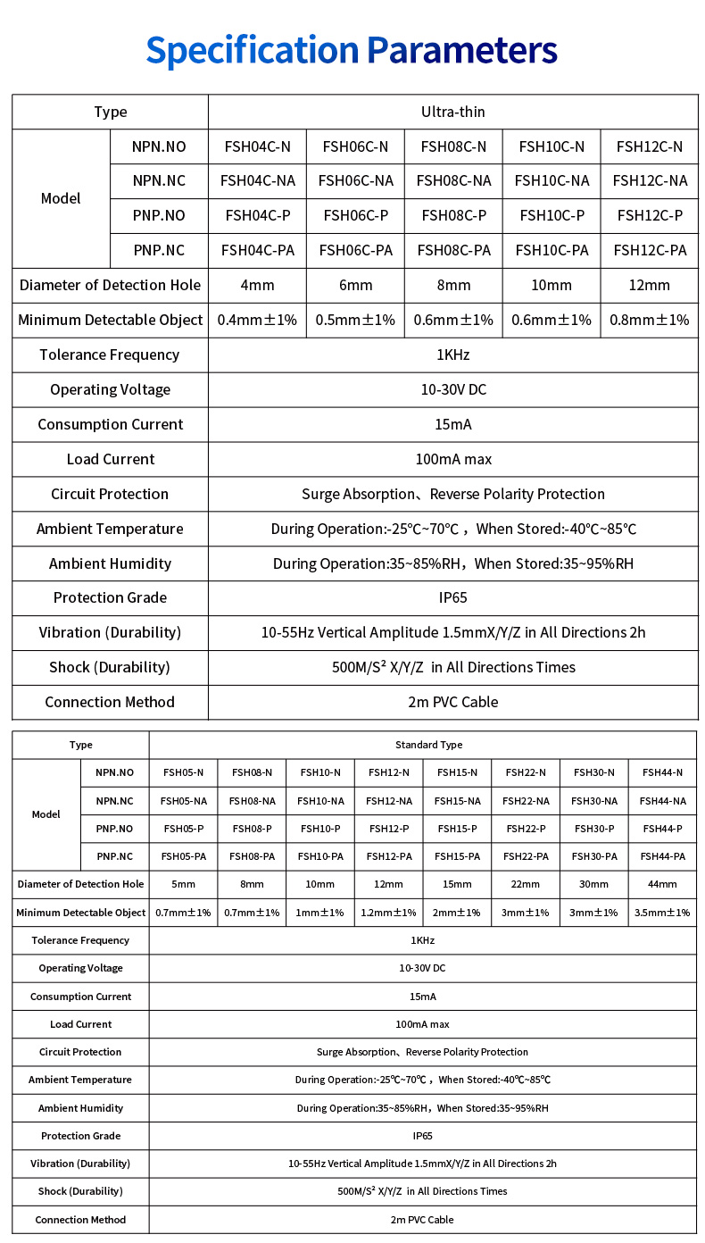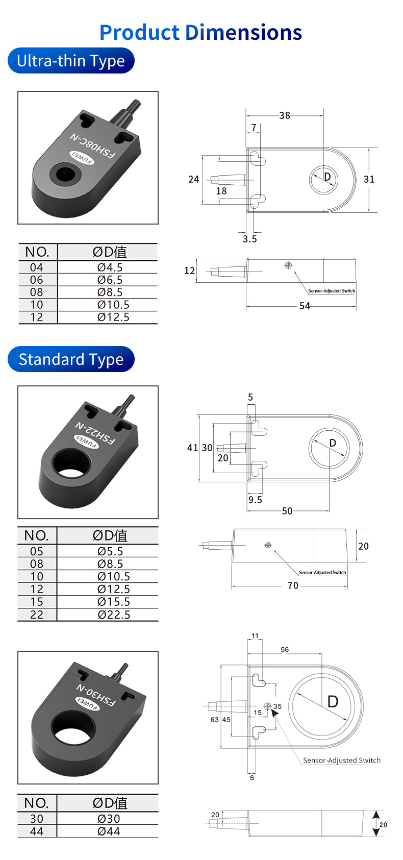 A Sensor for Every ApplicationWe understand that no two automation setups are identical. That’s why the FSH05-FSH44 series is available in two distinct form factors and multiple aperture sizes.Ultra-Thin Type: Ideal for space-constrained environments where mounting real estate is limited. Its slim profile allows for installation in tight machinery without compromising on detection performance.Standard Type: Offers robust performance for general-purpose applications, providing a sturdy and reliable sensing solution.
