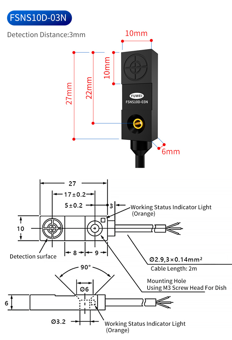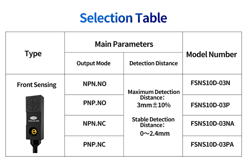 Before diving into the technical specifications, let's clarify the fundamental value the FSNS10D-03N brings to your system:Achieve "Zero-Defect" Detection with Unmatched Stability: Engineered with stable detection capabilities and strong anti-interference capability, this sensor reliably ignores surrounding metal clutter and electrical noise. This translates directly to reduced downtime, higher product quality, and lower maintenance costs.Unlock Higher Speeds with Intelligent Responsiveness: The integrated intelligent chip ensures an exceptionally fast response speed, enabling precise detection in high-speed automated processes. This allows you to increase cycle times and maximize throughput without sacrificing accuracy.Conquer Space and Environmental Challenges: Its compact design allows for easy installation in various narrow installation workspaces. Coupled with a IP67 waterproof and dustproof rating, it performs reliably in environments where other sensors would fail, offering unparalleled installation flexibility and durability.Simplify Integration with Dual Sensing Versatility: Unique to its class, the two sensing modes allow you to adapt the sensor's behavior to your specific actual installation conditions. This