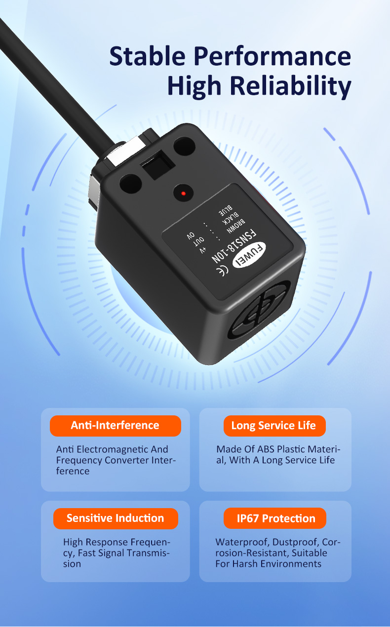 In the modern industrial automation landscape, where efficiency and precision are paramount, the reliable detection of every component is the cornerstone of a seamless operation. The FSNS18-10 Series Square Proximity Sensor from Fuwedi Electronics is the premier solution engineered for this critical task. More than just a sensor, it acts as an "Intelligent Perception Agent" on your production line. With its stable 10mm detection distance, built-in intelligent chip, and military-grade durability, it is extensively applied across industries like machine tools, textiles, logistics, and auto repair, dedicated to elevating your equipment's intelligence and productivity.