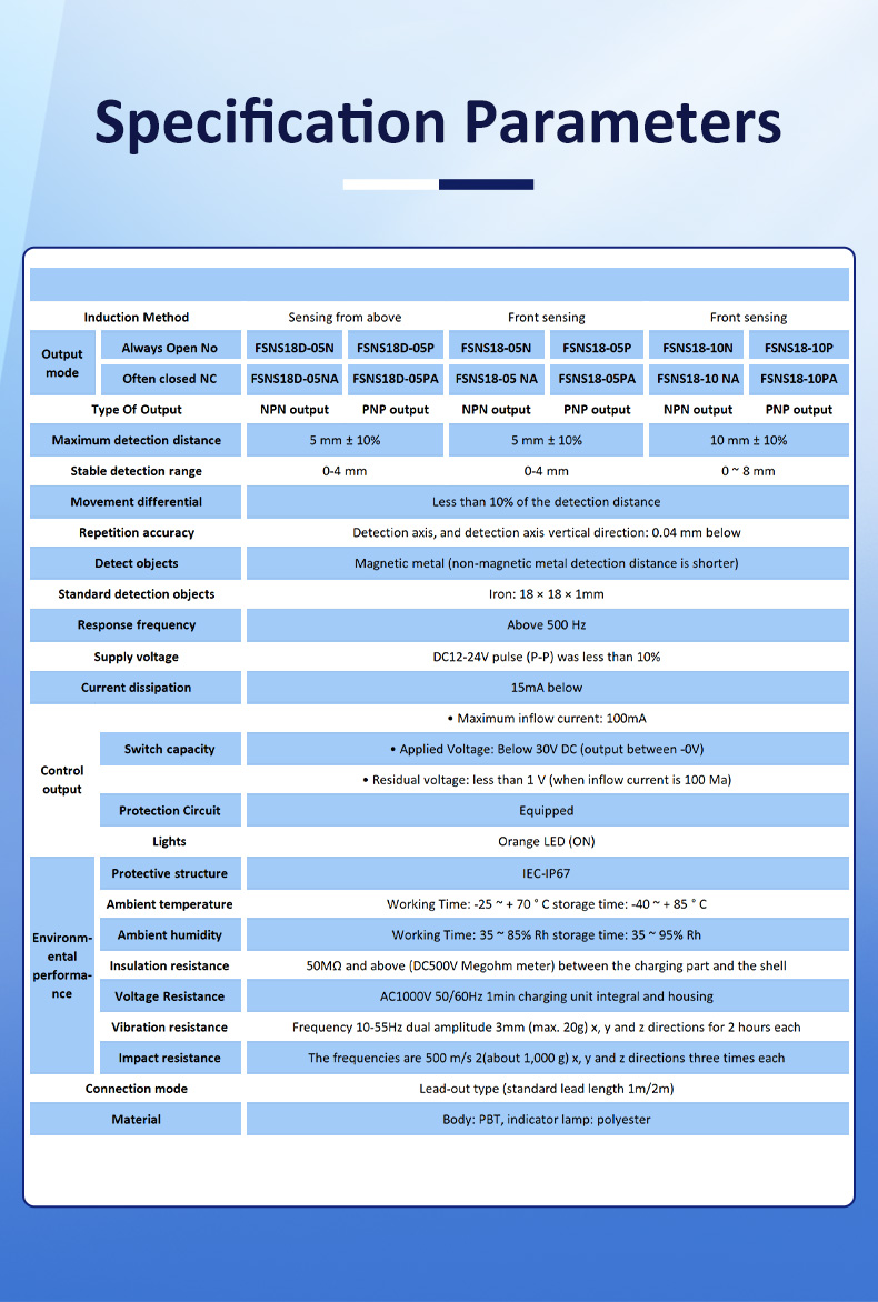 The FSNS18D-05 is engineered for versatility. Here are its primary application scenarios:Machine Tool Equipment & Lathes: Ideal for tool positioning, turret alignment, and end-of-travel limit sensing. Its reliability ensures machining accuracy and protects expensive equipment.Textile Industry: Used for detecting yarn breakage, monitoring loom shuttle position, and counting fabric rolls. Resistant to fluff and vibration.Auto Repair & Automotive Assembly: Perfect for robotic weld gun positioning, part presence verification on fixtures, and detecting clamps and jigs.Logistics & Assembly Lines: Excellent for pallet detection, sorting system object presence, and counting boxes on conveyors.Chemical Industry: The robust housing can withstand exposure to many chemicals, making it suitable for valve position feedback and level detection in non-aggressive environments.